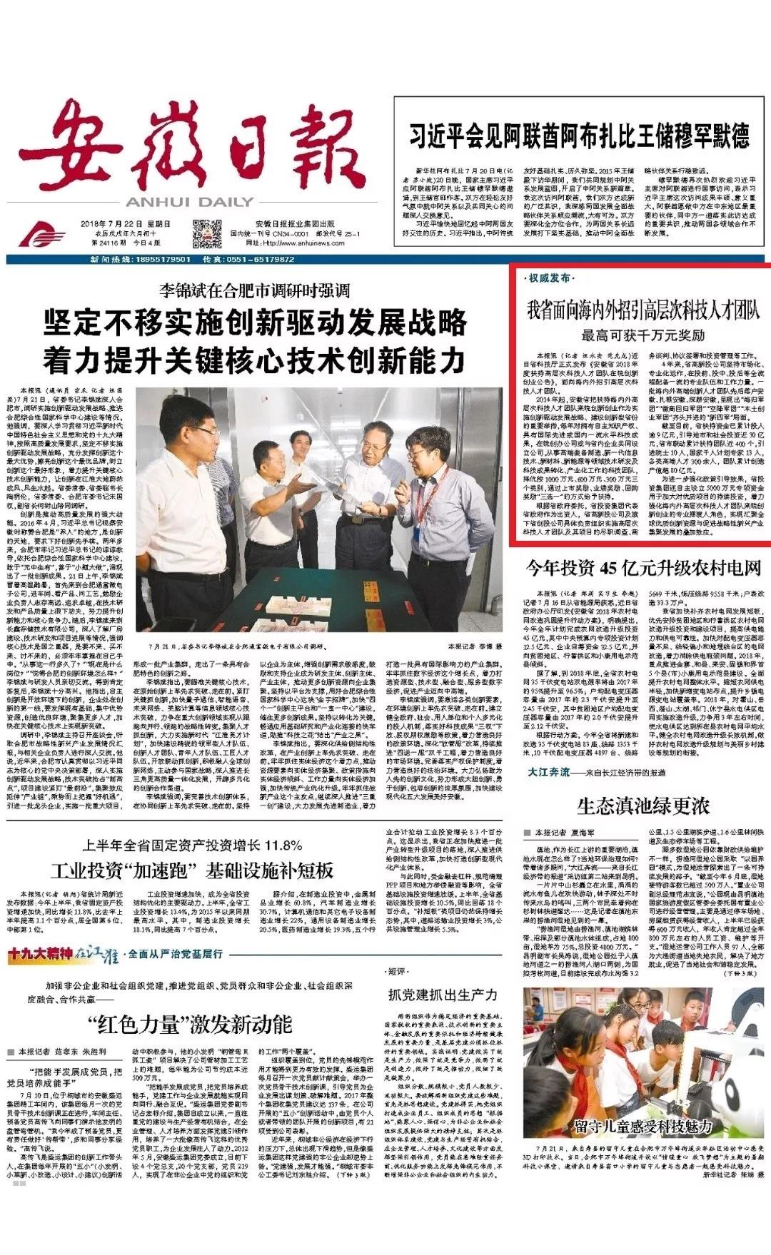 7月22日的《安徽日报》头版刊发题为《我省面向海内外招引高层次科技人才团队——最高可获千万元奖励》的新闻通讯,深度报道省投资集团、省高新投公司招引团队工作。