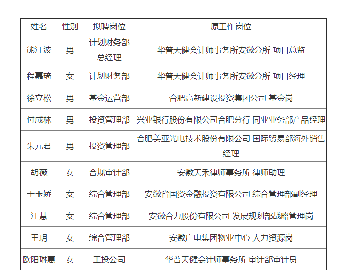 根据安徽省人力资源和社会保障厅、安徽省人民政府国有资产监督管理委员会相关要求,现将安徽省高新技术产业投资有限公司2017年第一批社会招聘拟录取情况予以公示。